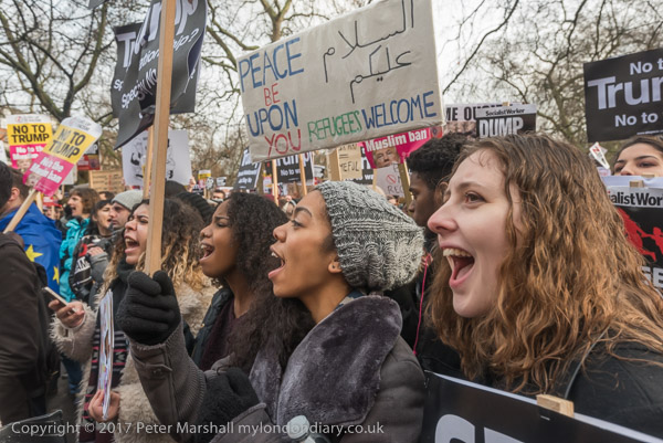 Thousands of protesters, many with inventive placards, pack into Grosvenor Square in front of the US embassy and in the gardens to listen to speakers including Brent Labour MP Dawn Butler who resigned as shadow minister for diverse communities to vote against the Brexit Bill and NUT General Secretary Kevin Courtney.