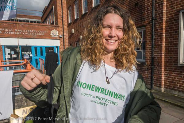 The protesters say they felt morally driven to take action and do not feel guilty in the face of the bigger crime that they want to prevent: airport expansion is a red line for climate change, increases already illegally high levels of air pollution and destroys local communities. Sophia made her views clear by wearing a t-shirt with the message '#NoNewRunways - 'Guilty of Protecting the Planet' for her trial.