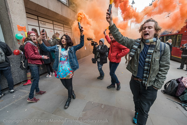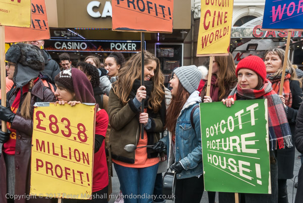 The protest, timed for tomorrow's Oscars ceremony, started outside the Empire Cinema in Leicester Square, newly acquired by Cineworld, the owners of Picturehouse Cinemas. Cineworld offer employees a company run staff forum rather than recognising trade unions and fail to pay their London staff a living wage or provide decent conditions of service, despite large profits from cinema-goers paying £13 or more to see a film. The staff are striking for £9.75 per hour, while Mooky Greidinger, CEO of Cineworld gets around 60 times as much.