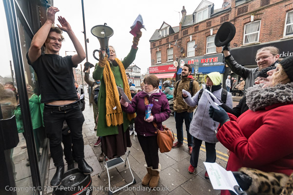 Based on the traditional wassail in orchards which encouraged apple trees to flourish and bear heavy loads of fruit particularly to make cider, the wassailers toured the area, led by storyteller Rachel Rose Reid and the Cricklewood Community Singers performing a version of the traditional wassail song, with performances by local poets, storytellers and singers at various stops on their way to the crab apple trees behind Willesden Green Library before returning to Tone Coffee Shop for hot drinks and more entertainment.