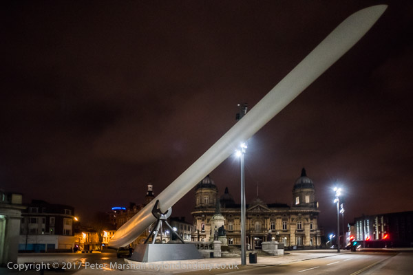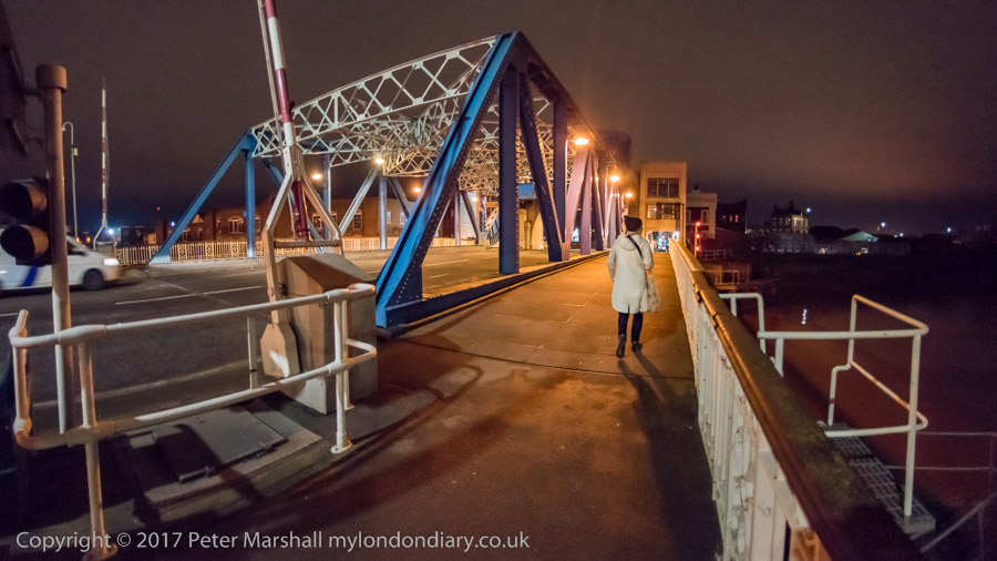 I took a detour along the bank of the Hull on my way into the city centre in the morning and made a number of panoramic images. After lunch I walked up from the Museums area along High St and Dock Office Row to North Bridge and photographed the former dock entrance and dry docks there, and later, as darkness fell, we went back across the river on the way to Princes Quay and the HIP gallery.
