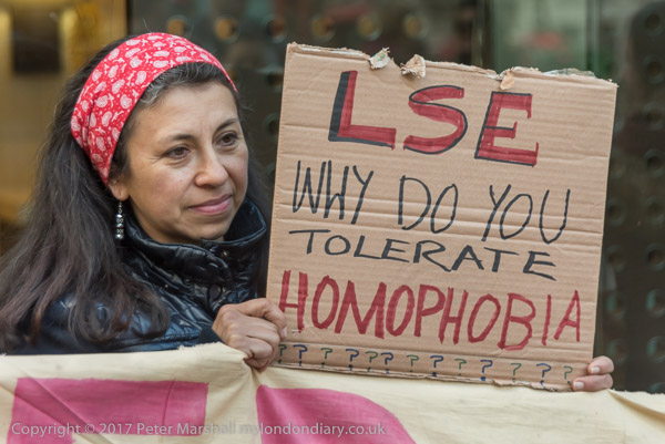 A woman holds up a poster 'LSE Why do you tolerate Homophobia????????????