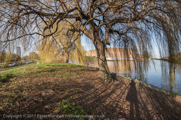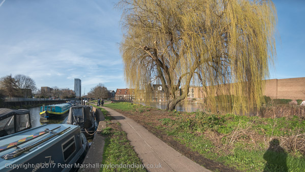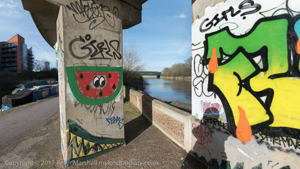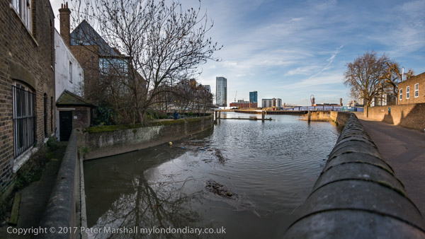 Lea Navigation at left and the tidal River Lea (Bow Creek) at right
