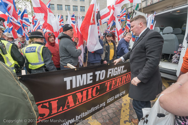 Marches and rallies by Britain First and the EDL (English Defence League) in reaction to the London terror attack were opposed by the Anti-Fascist Network, London Antifascists and Unite Against Fascism (UAF) who accuse the extremist right of using the attack to fuel their anti-Muslim and anti-migrant racist propaganda.