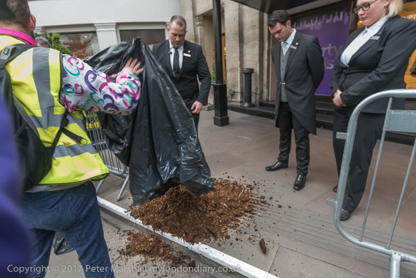 rushed up anActivists dumped a sack of horse manure and coackroaches at