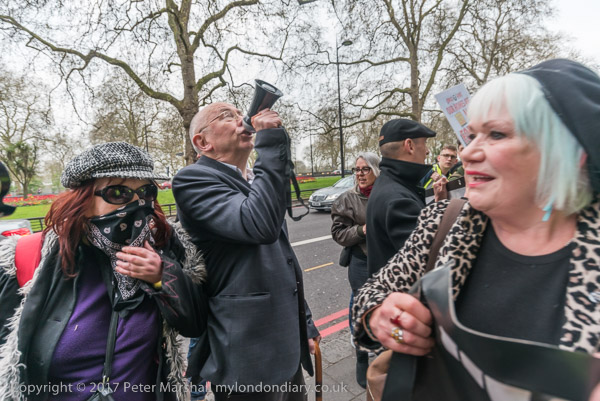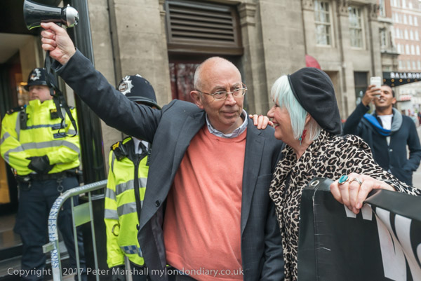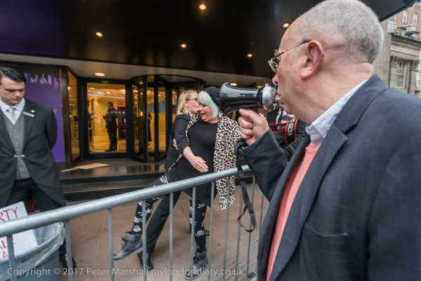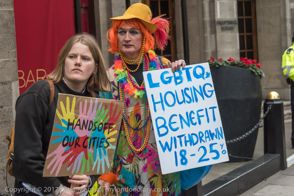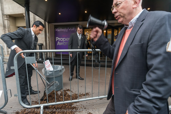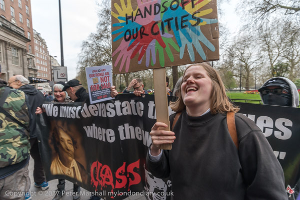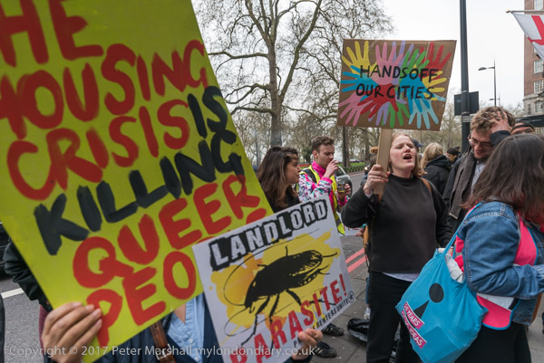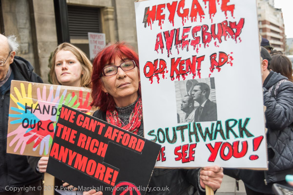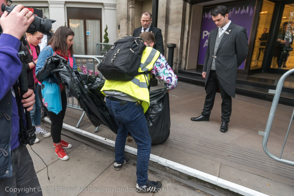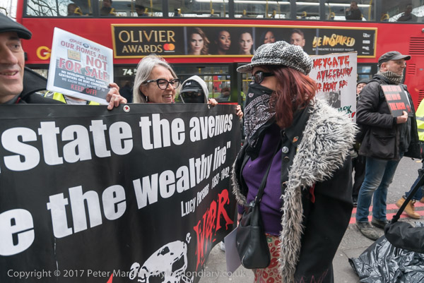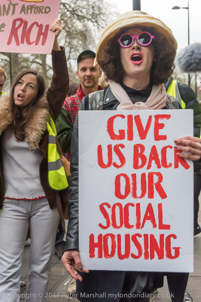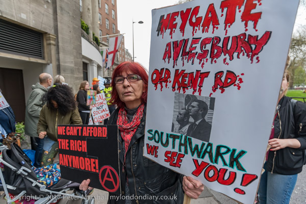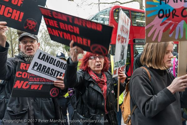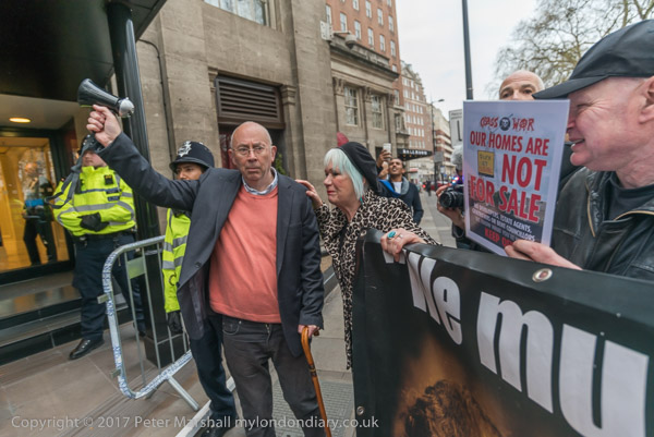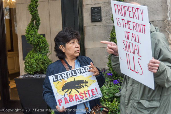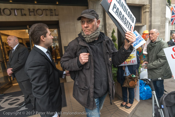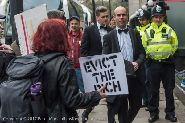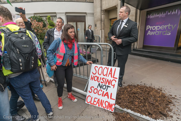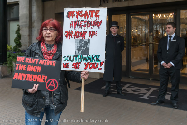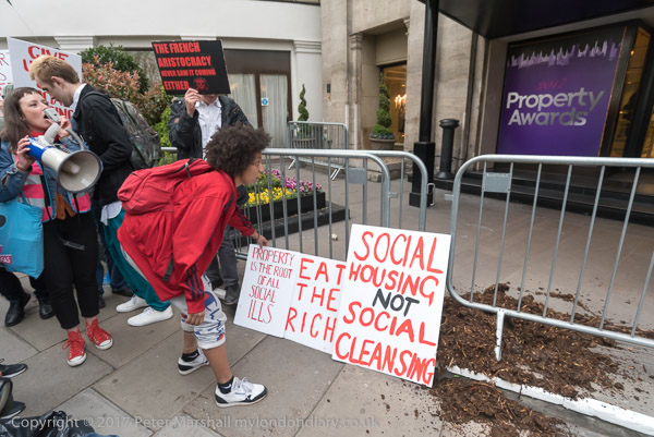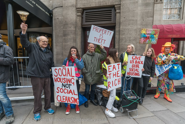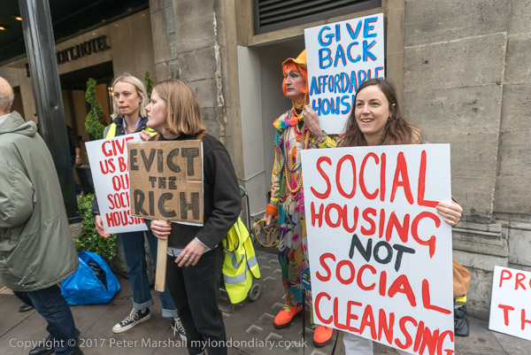 Protesters arrive at the Grosvenor House Hotel on Park Lane with posters 'Give Us Back Our Social Housing'
