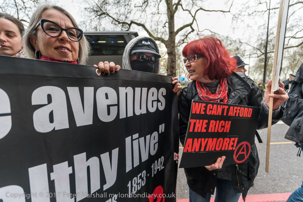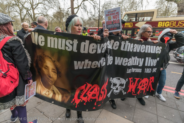 Class War hold their banner with the Lucy Parsons quote 'We must devastate the avenues where the wealthy live'