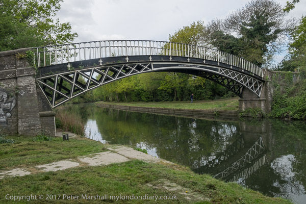 The towpath crosses to the opposite bank over Gallows Bridge.