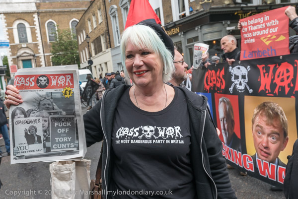 Jane Nicholl in Class War t-shirt holds up their new newspaper