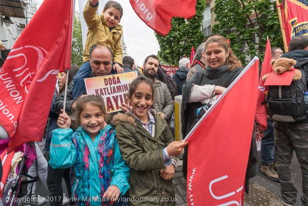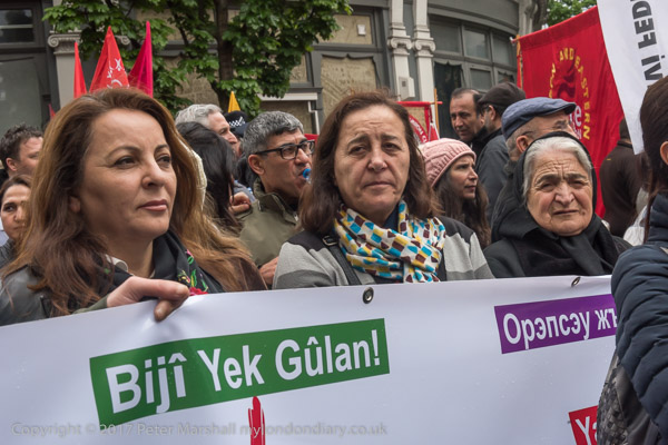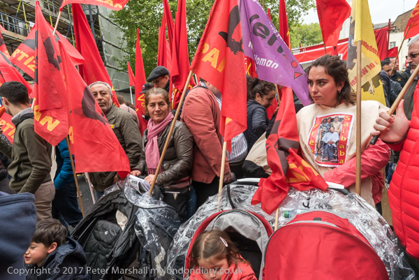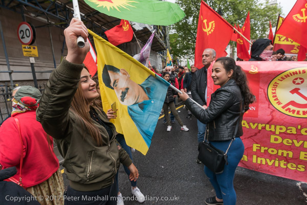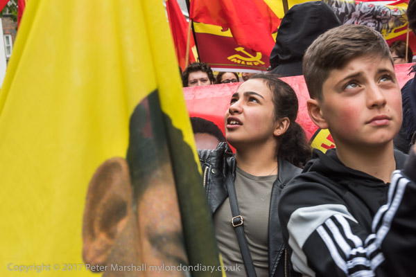 and a flage with Kurdish leader Abdullah Ocalan, held in a Turkish