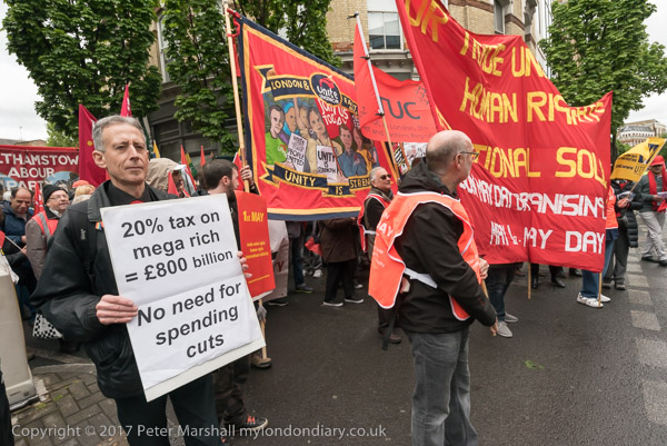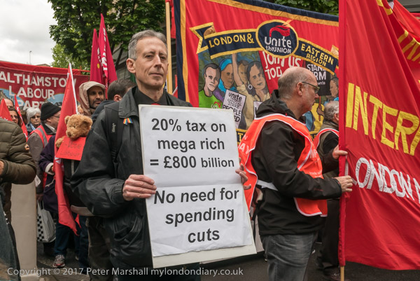 Peter Tatchell with a poster saying a 20% tax on the megarich would