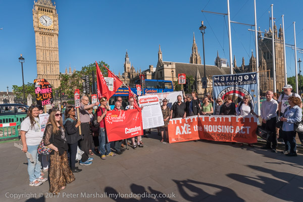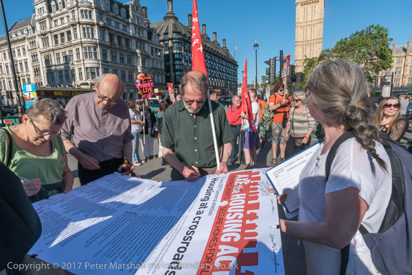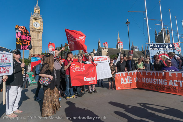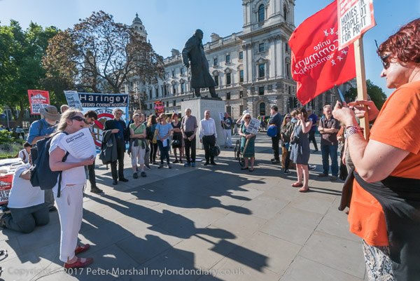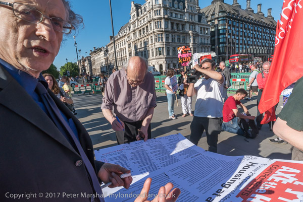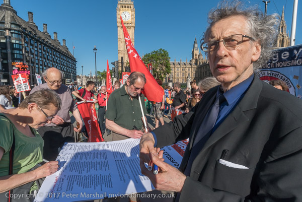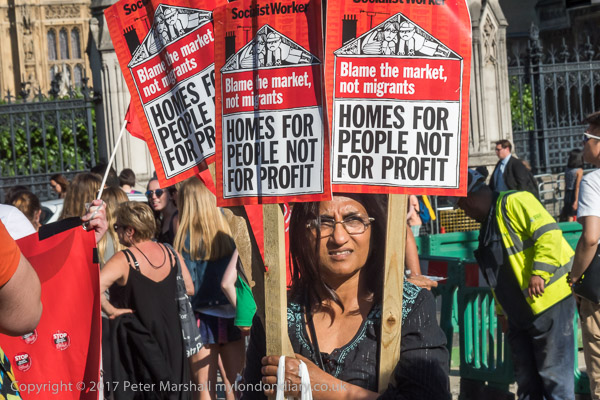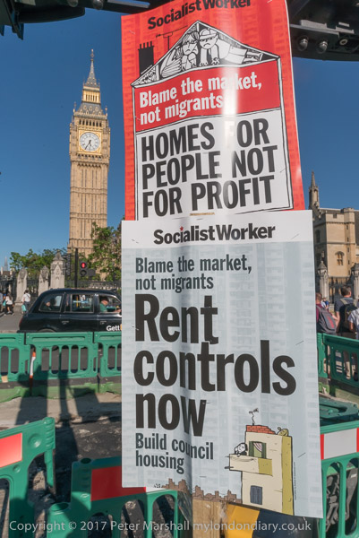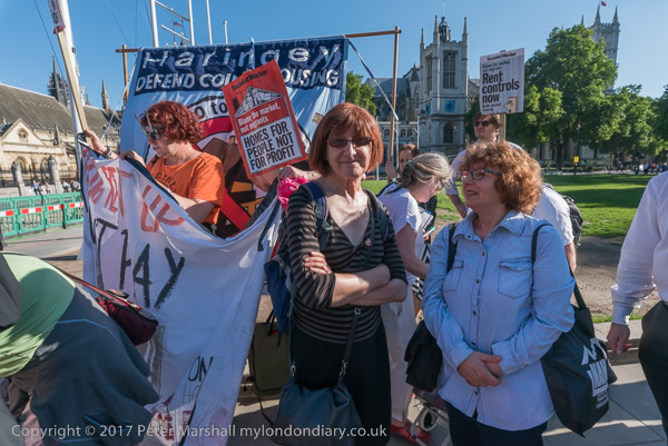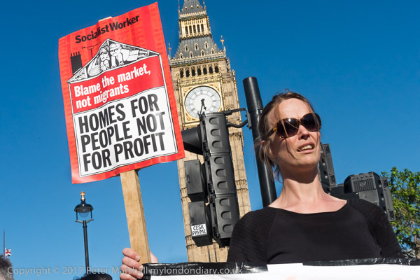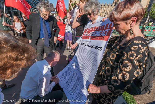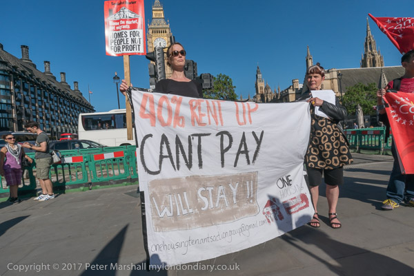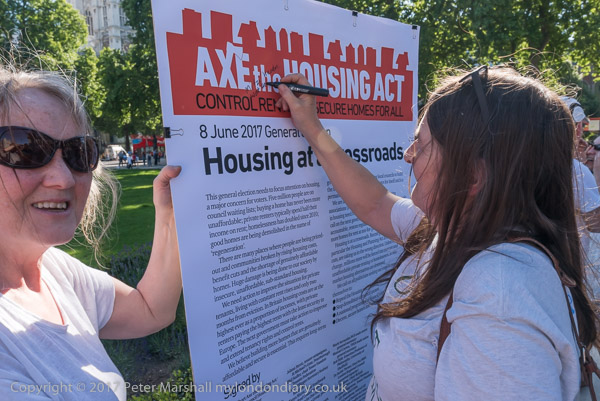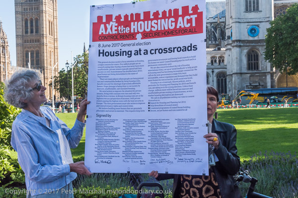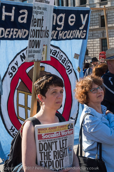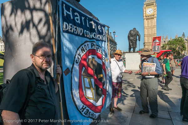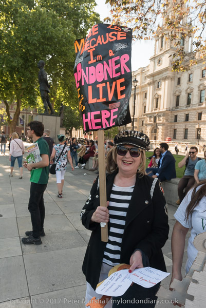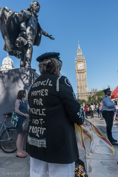 Pearly buttons spell out 'Council Homes for People Not Profit' and the placard