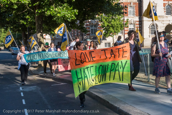 They march to the staff entrance behind the banner 'Love Tate Hate