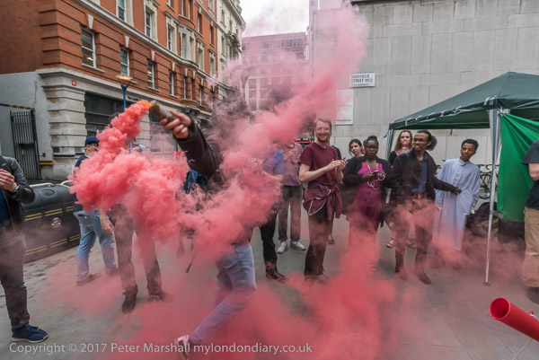 Two people sprayed a chalk slogans on the road while others alternated chanting 'London School of Exploitation' in various silly voices with loud blowing of vuvuzelas, creating a very strange and alien atmosphere which made many stop and listen, including those taking their lunch break at the nearby pub.