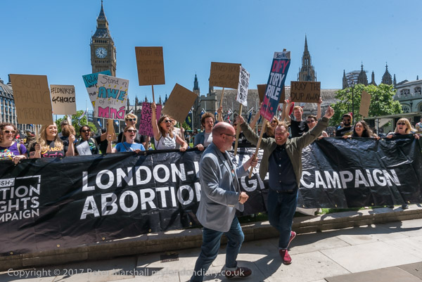 Shocked by the news that Theresa May is to govern with the help of the DUP, the London-Irish Abortion Rights Campaign protest in Parliament Square against the bigoted views they hold against abortion, women's rights and gay rights.