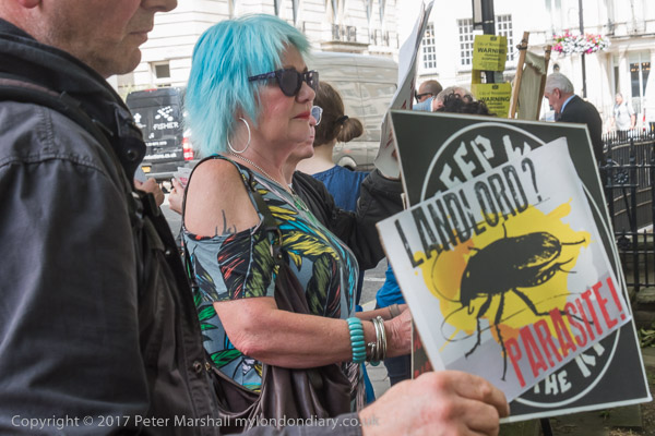 War hold up posters outside the London Real Estate ForumCampaigners, including members of Class War and the Revolutionary Communist Group concerned over London's housing problems protest noisily in Mayfair outside the London Real Estate Forum.