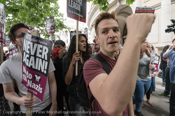 There were a few minor scuffles with EDL protesters on their way to the pub, but several hundred police kept the two groups apart, moving the UAF down to their assigned rally point on the Embankment before escorting the EDL to another location a couple of hundred yards away. After the EDL had been escorted back to the station, the UAF marched to join the women's rally at Downing St against Theresa May's collusion with the UDP to prop up her minority government.