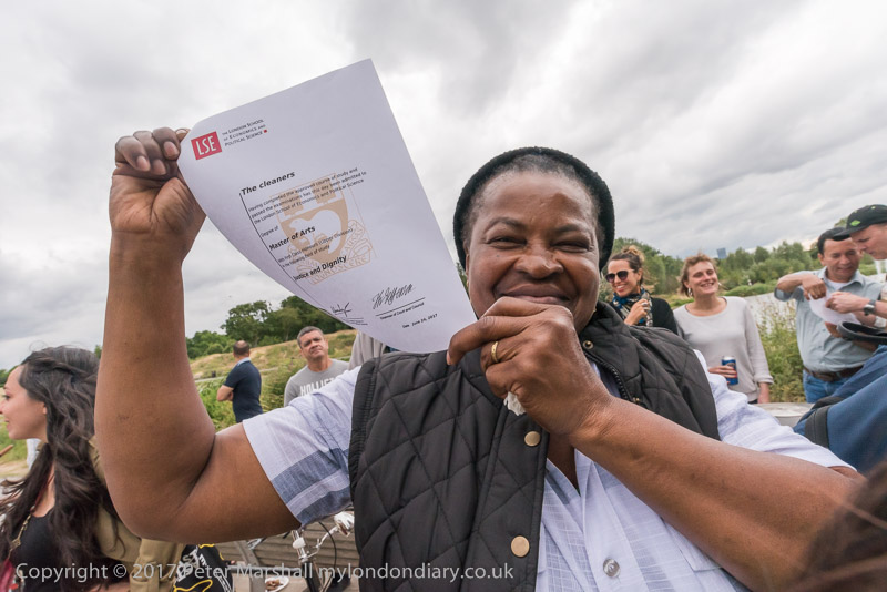 During the party there were speeches by several of the cleaners and they were presented with 'Masters of Arts' certificates with First Class Honours in Justice and Dignity.