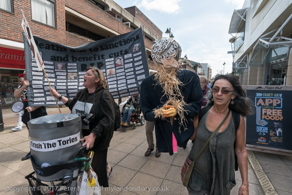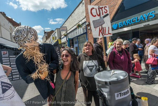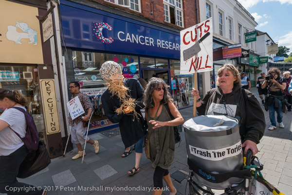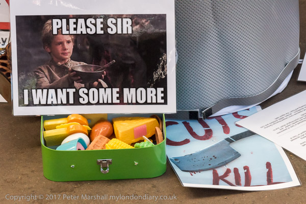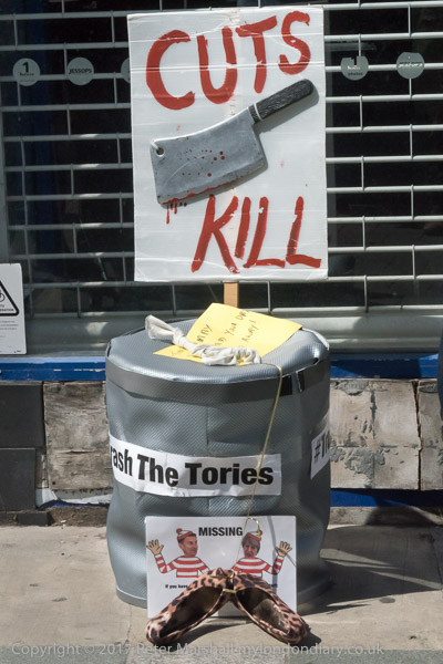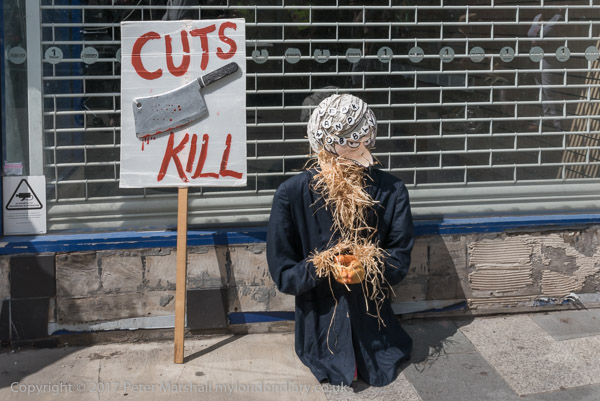 and a straw effigy of May next to a 'Cuts Kill# banner with a cleaver