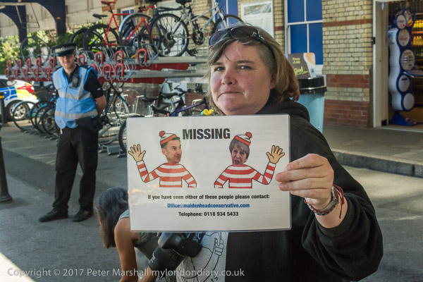 Paula Peters holds up a 'Missing' poster for Theresa May and Philip Hammond