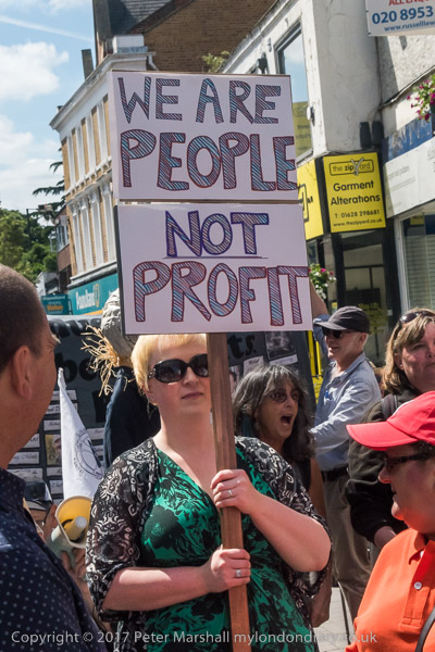 Paula Peters holds the 'Cuts Kill' placard and behind her is a large