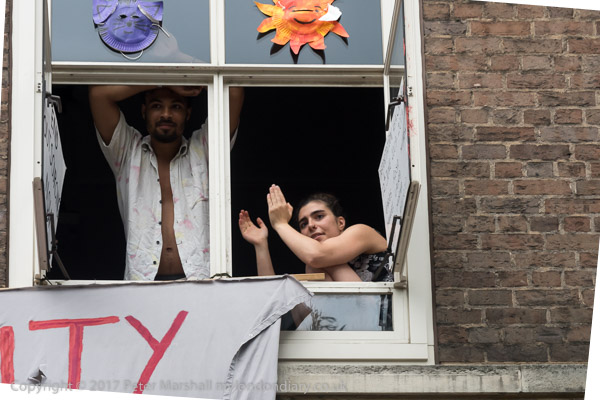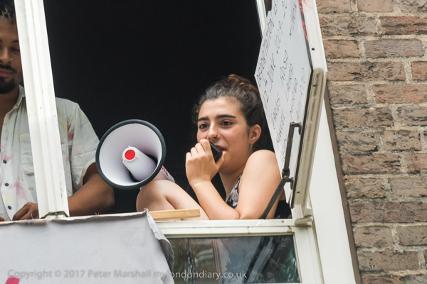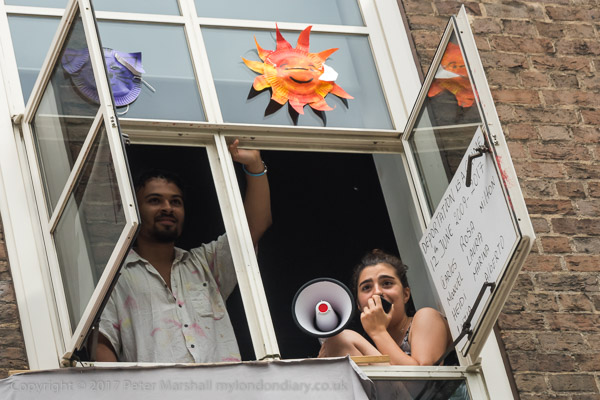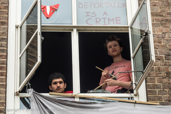 On the window it states 'Deportation is a Crime'. One of the occupiers