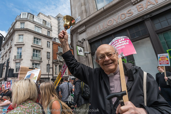 Rev Paul Nicolson from Taxpayers Against Poverty rings his bell