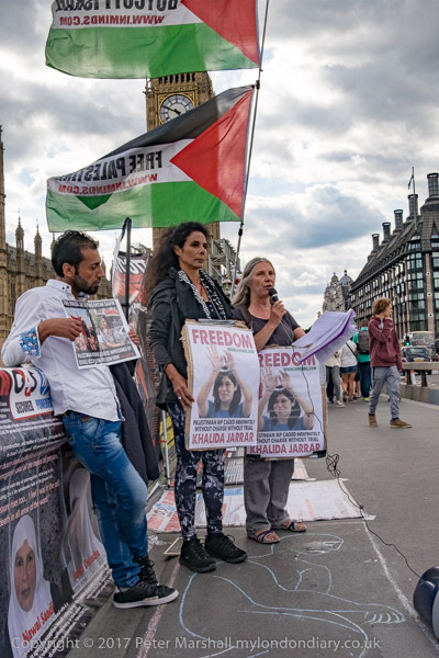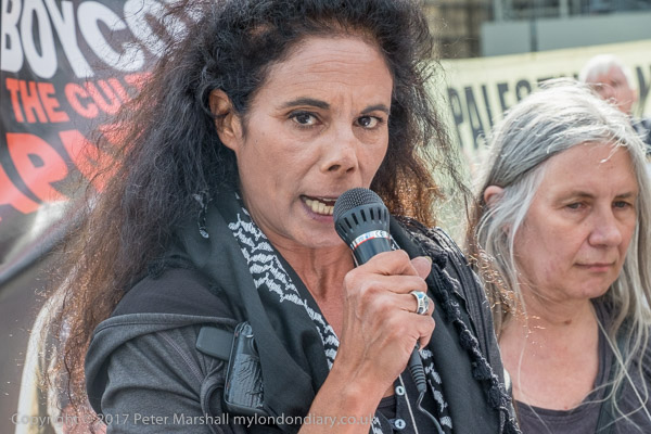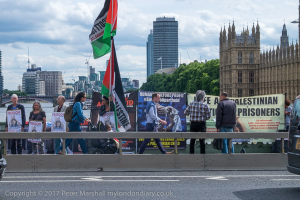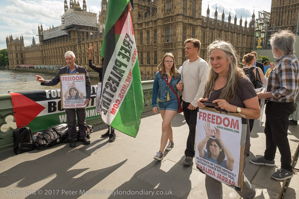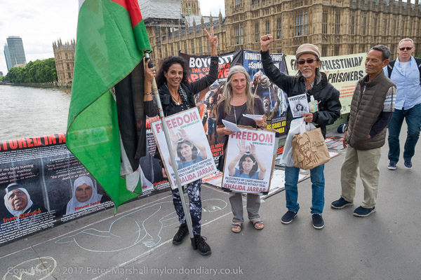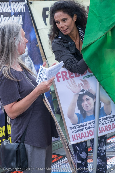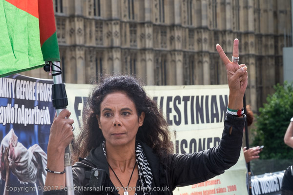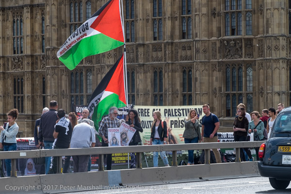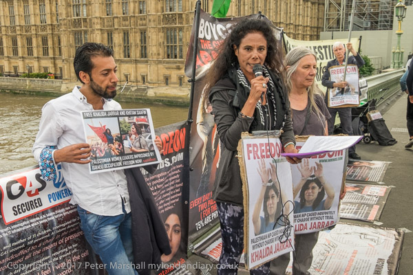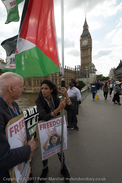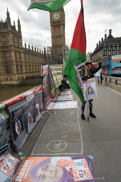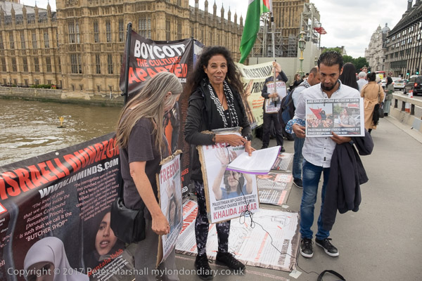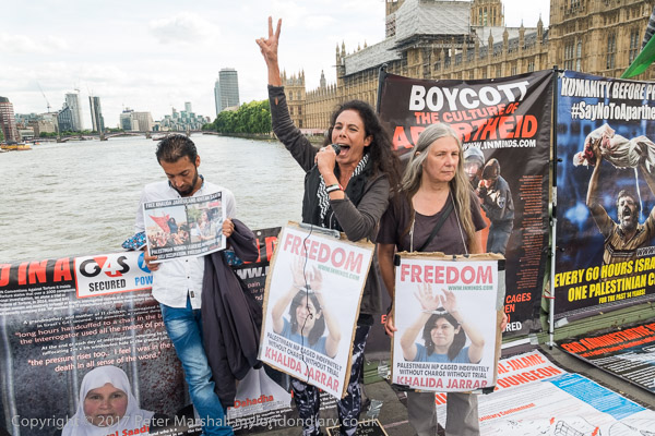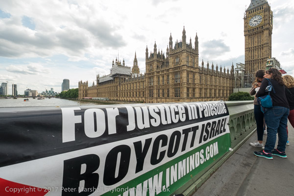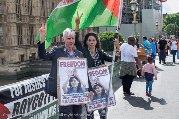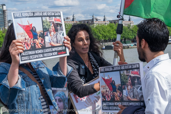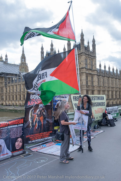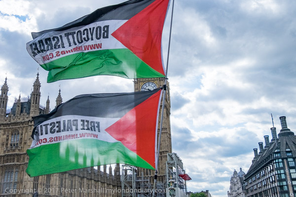 One flag has the message 'Free Palestine' and the other 'Boycott Israel'