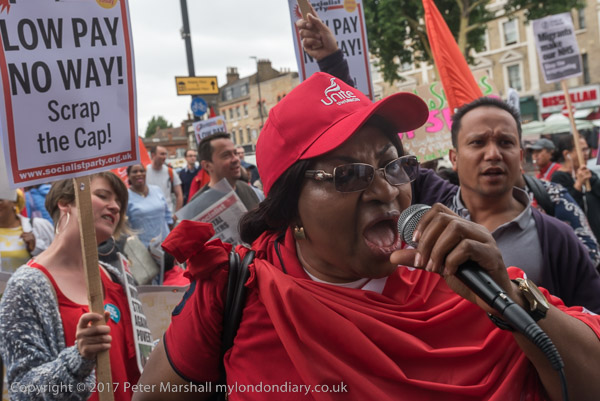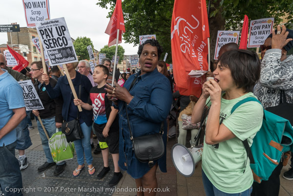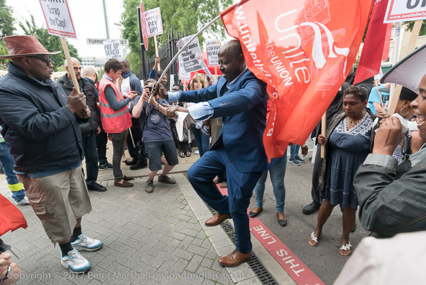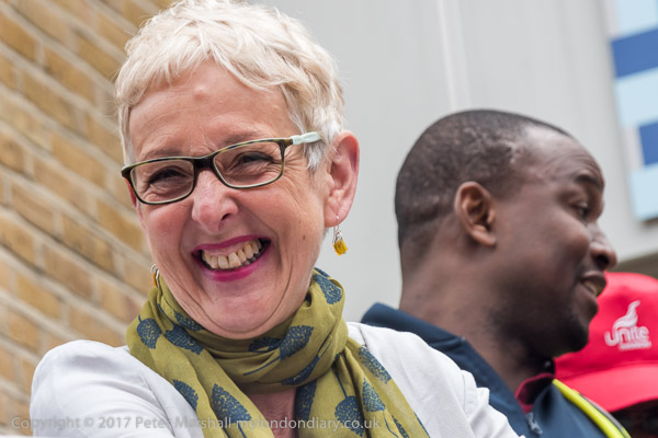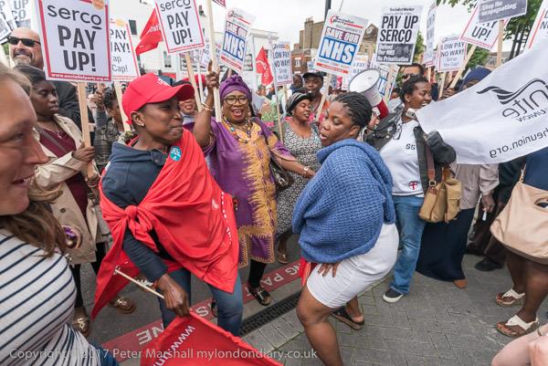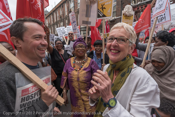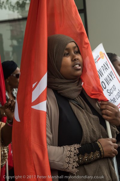 Cleners and supporters gatherd on the narrow pavement of the Whitechapel