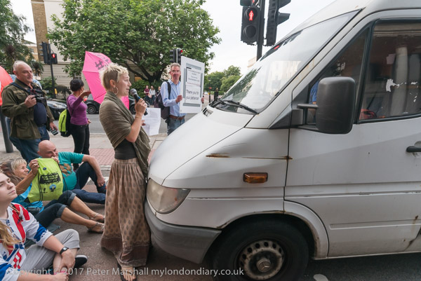 The protesters walked into the road with banners and umbrellas with the message 'Stop Killing Londoners' and sat down while a statement was read explaining why they were protesting and that it would only be a delay of 5-10 minutes, then danced in front of the blocked traffic before leaving the road.