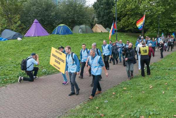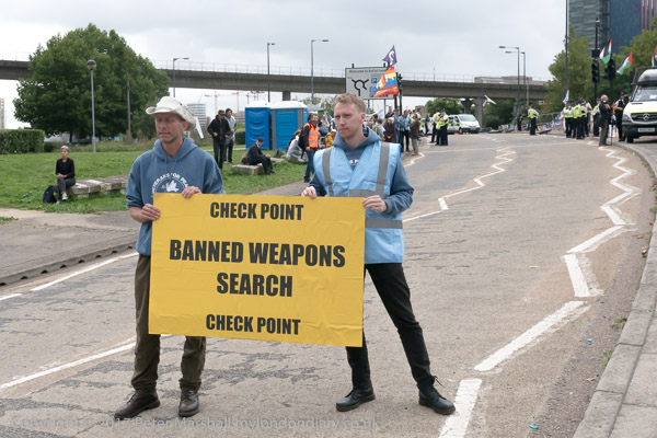 Veterans For Peace pose with their 'Check Point - Banned Weapons Search'