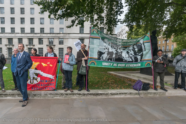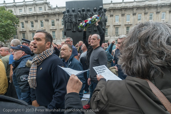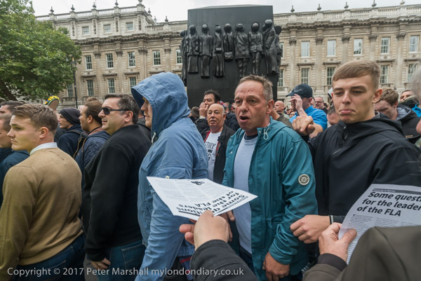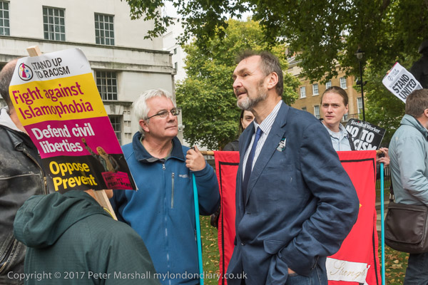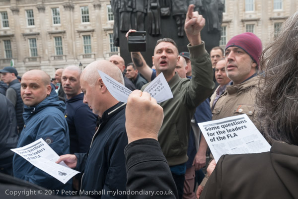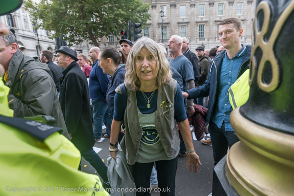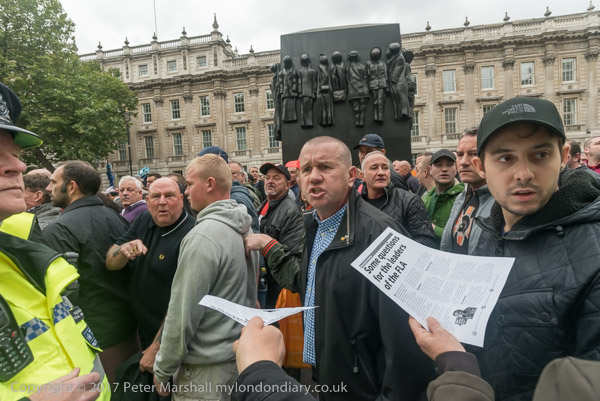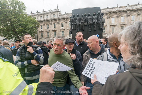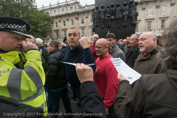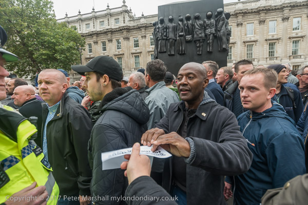 Stand up to Racism supporters try to had out a flier to the marchers, but