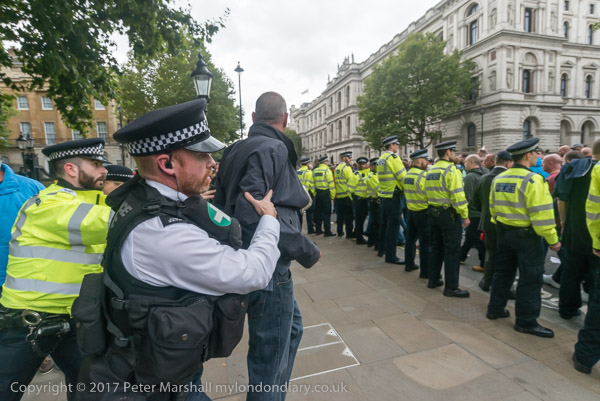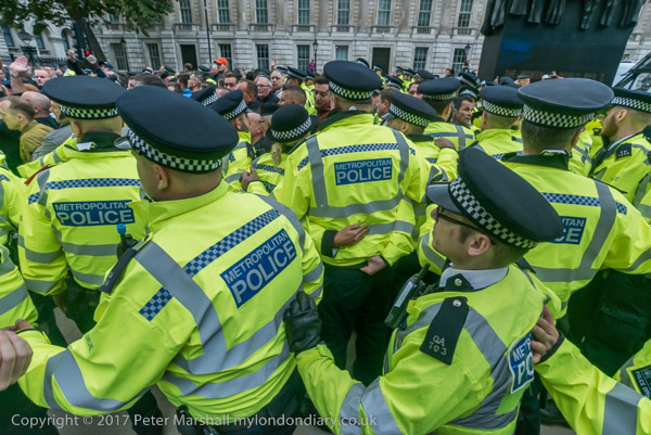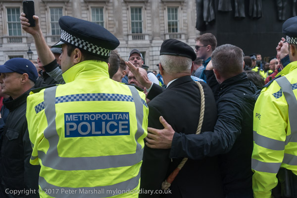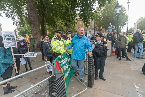Police eject a FLA supporter from the protest by Stand Up to Racism