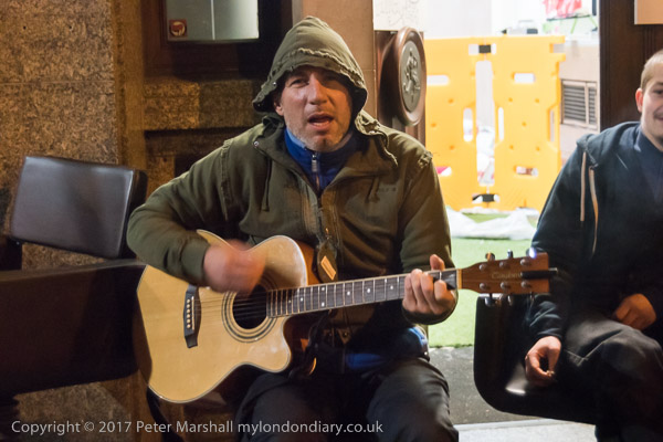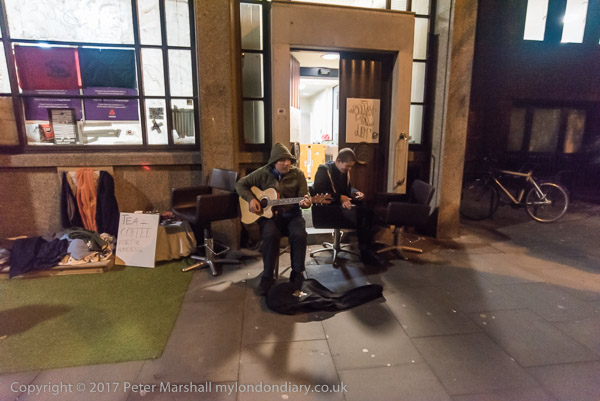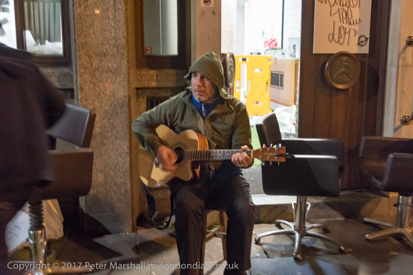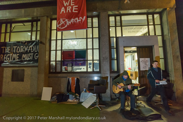 One of the ORAL squatters sits outside the squatted bank playing guitar
