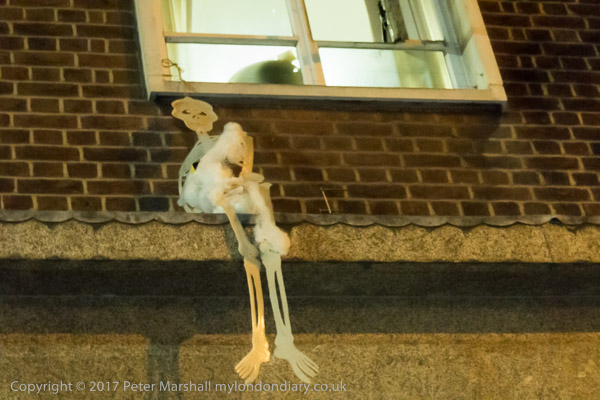 and a crude skeleton hangs from a first floor window