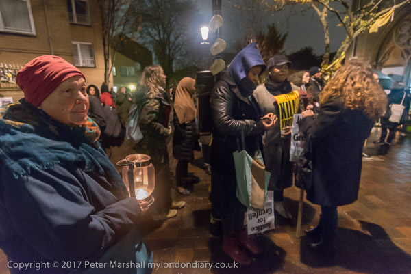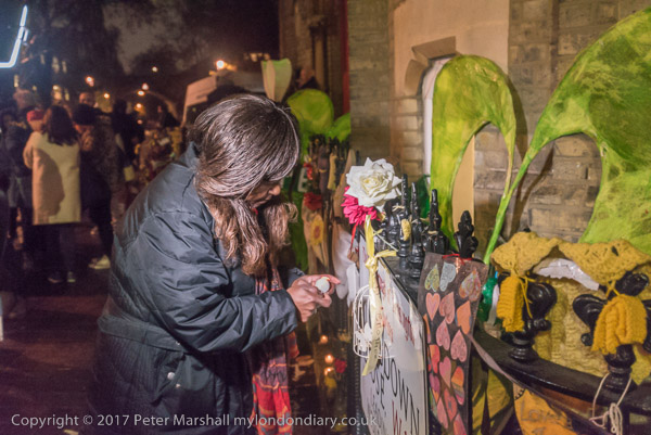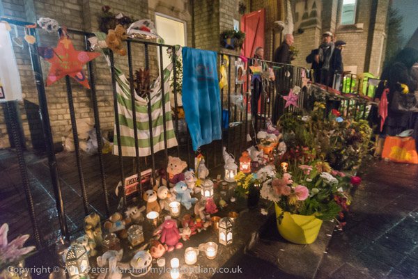 Pepole ight candles to add to the display of flowers in front of Notting