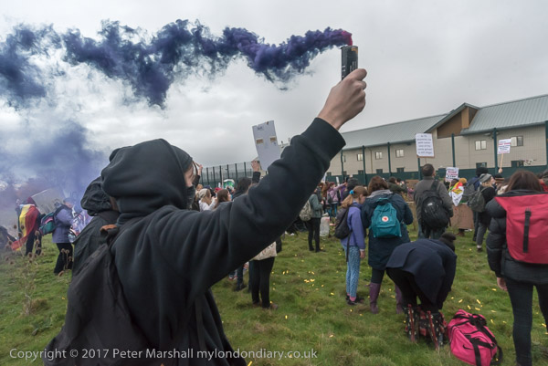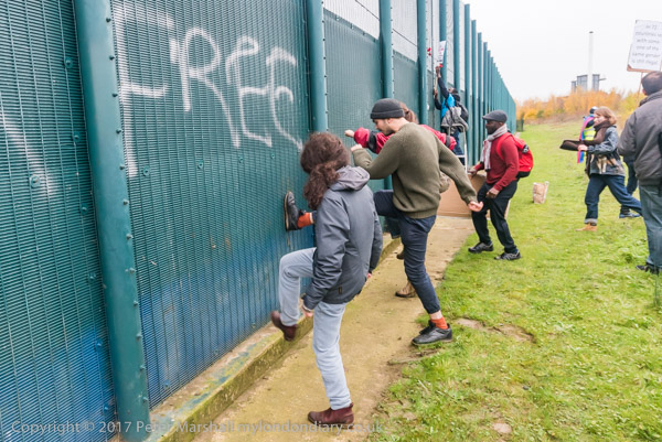 and are soon at the fence with graffiti from a previous protest 'nobody