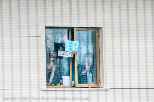and from other windows women wave and hold messages 'SOS Plz' , '5