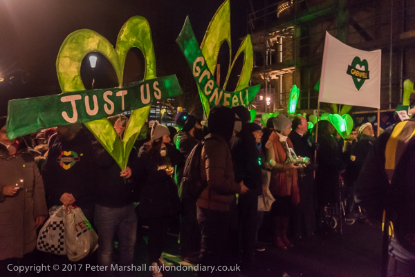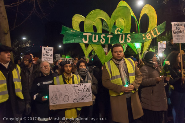 Some have message 'JUST US' , 'GRENFELL', 'JUSTICE'.