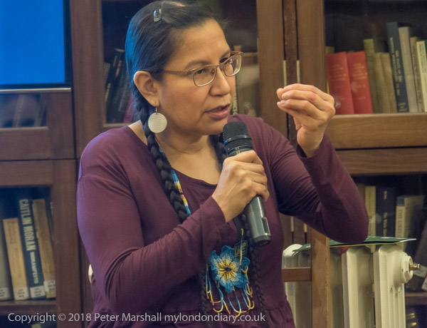 She described the thoughts and world view of nêhiyawak, Cree laws which are shared and passed down through oral tradition and landbased use, utilizing stories, songs, ceremonies, and other sacred rites, and how these operate, as well as how they have been sidelined through the process of colonisation, and the apparatus of systematic repression and genocide, with various treaties which failed to respect the traditional world view, as well as Acts of Parliament which listed over 200 crimes which could only be committed by an "Indian" including holding a potlatch, hiring a lawyer to pursue land rights, keeping a child home from Indian Residential School and travelling without permission given by an Indian Agent.