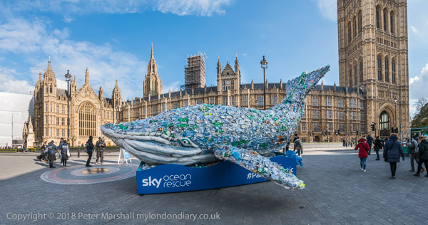 Plasticus the Whale from Sky Ocean Rescue, made of a quarter of a ton of plastic waste, the amount dumped in the ocean every second - a total of 8 million tons a year, was outside Parliament today in its campaign to stop the damage to the world's oceans caused by single use plastic.