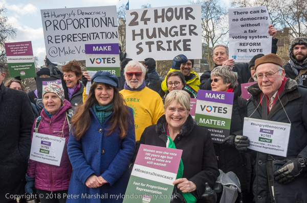 Campaigners pose in Parliament Square as four hundred fair vote campaigners take part in a 24 hour hunger strike, #Hungry4Democracy, organised by Make Votes Matter (MVM) in protest against our dysfunctional electoral system and to urge Proportional Representation.