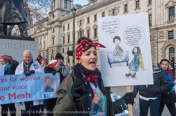 Campaigners protest in Parliament Square on the 100th anniversary of the first votes for women in the UK calling for a suspension on the use of mesh implants to treat incontinence and prolapse often caused by childbirth.