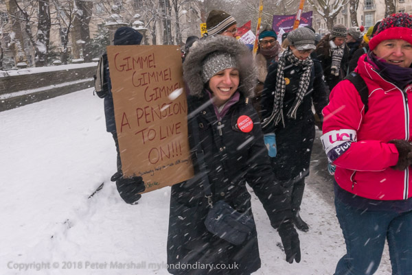 On the fifth day of their strike to get the universities to talk with them about pensions and pay, UCU members marched through heavy snow showers to a rally close to parliament. They were joined by staff from London FE colleges on the first day of a two-day strike over pay and conditions, and both groups were supported by large numbers of students.