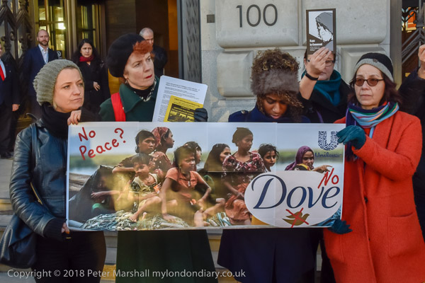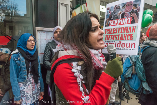 An emergency protest close to the Israeli embassy condemns the cold-blooded shooting by the Israeli army of peaceful protesters near the separation wall in Gaza yesterday.