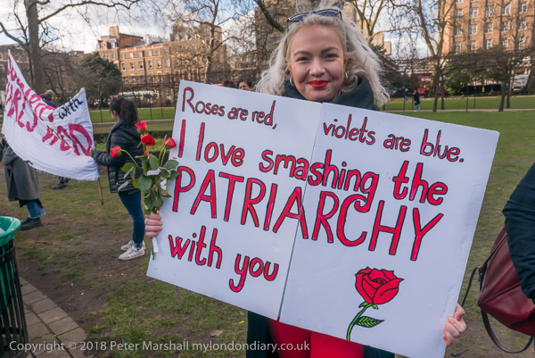 Over a thousand people, mainly women, are at the London Women's Strike in Russell Square on International Women’s Day.