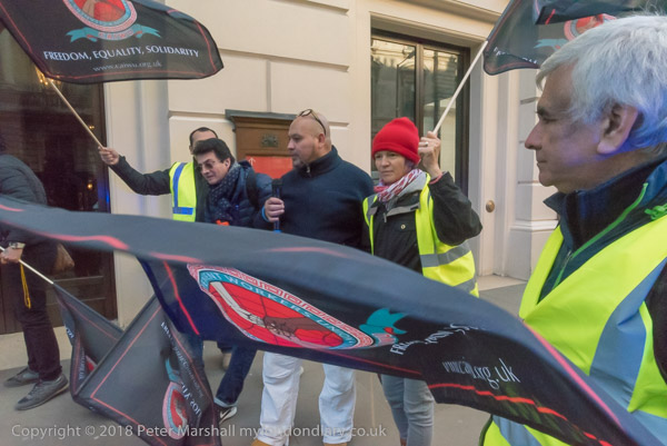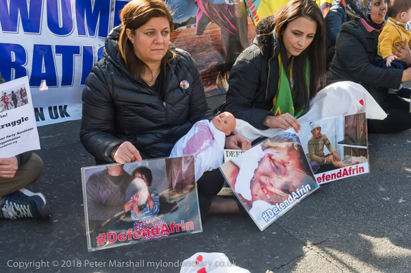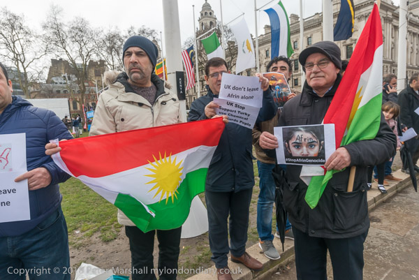 People met in a street near Marble Arch to march to Parliament Square demanding an end to the invasion of Afrin by Turkish forces and al Qaeda-affiliated militias which aim to destroy a peaceful state and eliminate the majority Kurdish population of the area.