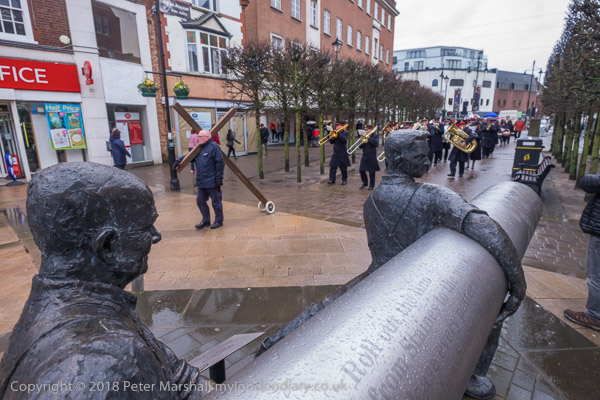 The service included hymns, songs, prayers, readings and an address about Christ's passion and resurrection with contributions from leaders of many Staines Christian groups. Bad weather, with some heavier showers of rain meant that the band had to move to shelter under the covered area in front of the shops and probably explained the lower attendance at the event.