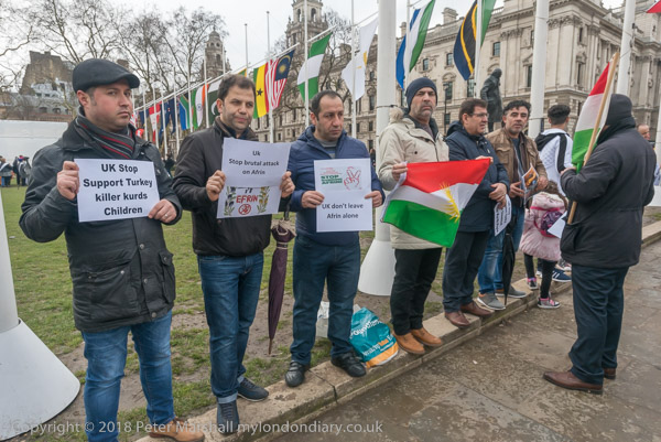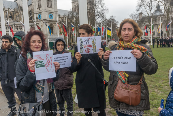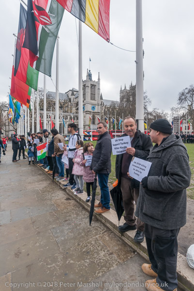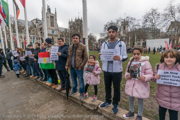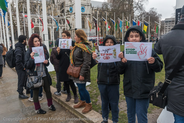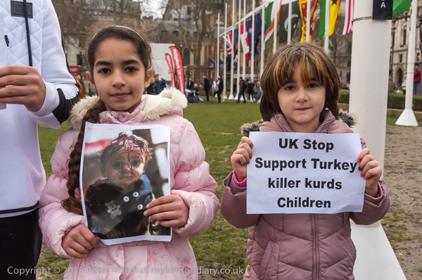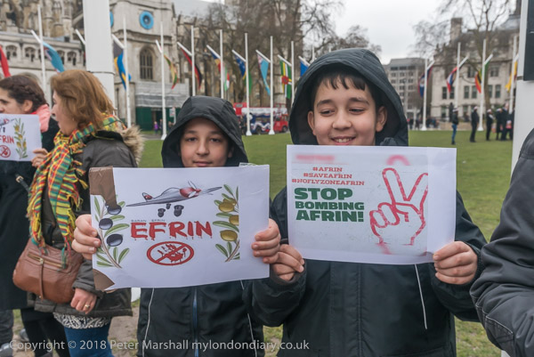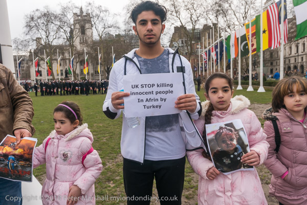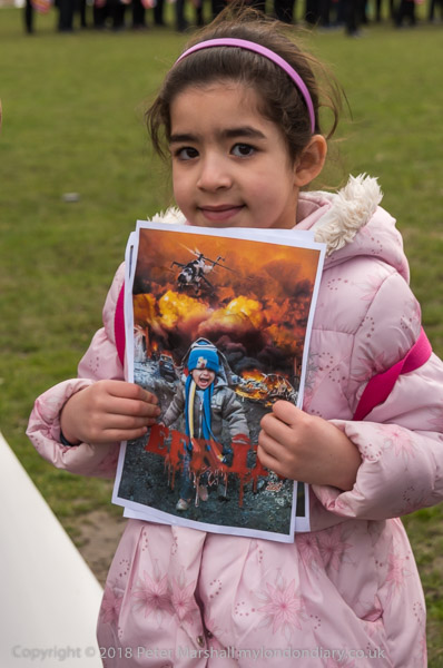 A child holds a picture of a child being bombed in Efrin (Afrin)