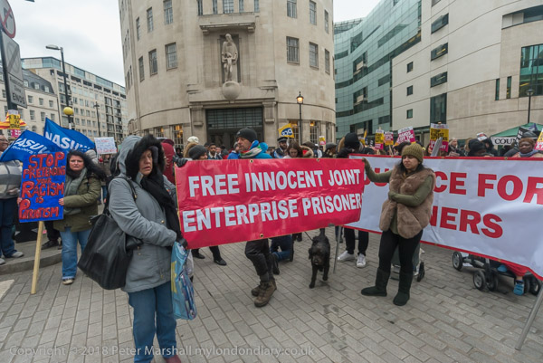 'Free Innocent Joint Enterprise Prisoners' banner in front of Broadcasting